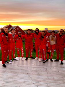 The team is wearing matching red kits, with their names and sponsors on the front. They are posing in front of a sunset, suggesting the end of a season or an important match. The setting appears to be a wooden deck, and the mood is one of camaraderie and accomplishment.