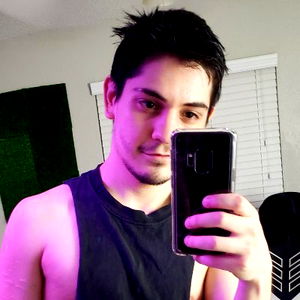 In the image, Aiden is seen capturing his casual moment in front of a mirror. He is dressed in a black tank top and holds up a phone to take the picture. The background shows a cozy living space with a purple hue. His hair is styled in a spiky manner, giving off a relaxed vibe.