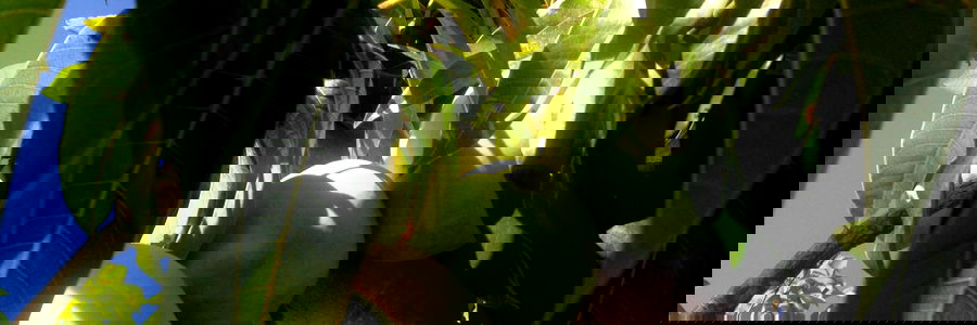 A close-up view of a plantain tree in its early stages of fruit production. The green fruit is still growing and will need more time to fully ripen.