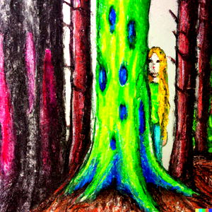 This is an artwork depicting a surreal forest scene, where a woman stands among the tall trees. The forest features unusual colors and patterns on the trees, giving it a dreamy or fantastical atmosphere.