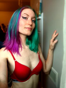 AuroraHeat, the vibrant and youthful social media personality, captures attention in this enticing image. With a striking look characterized by colorful hair and a mix of red, blue, and green clothing, Aurora stands out in this playful and sensual pose.