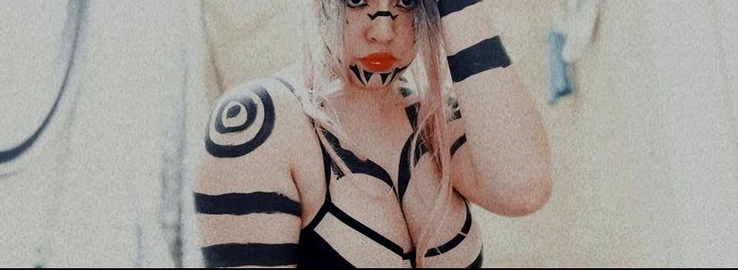 An OnlyFans model named Aurora Skye is captured in an image where she's wearing a futuristic outfit and has her face painted with swirling patterns. The backdrop is minimalist, allowing the focus to be on her unique attire and striking makeup.