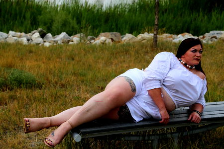 In this playful outdoor photo shoot, the model, Aurora Lee, is posing in a white top and pants. She's leaning casually on a bench with her legs crossed. Her relaxed demeanor adds to the casual yet vibrant atmosphere of the image.