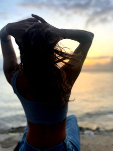 This image captures a picturesque outdoor scene on a bright, sunny day. The setting is a sandy beach, where the ground is speckled with fine grains of sand glistening under the radiant sun. The expansive sky above is a clear blue, adding to the overall summer vibe of the image. In the foreground, the central focus is a young woman elegantly clad in a bikini. Her swimwear, consisting of a matching swimsuit top and bottom, accentuates her toned physique. The swimsuit top, akin to a brassiere, and the swim brief-style bottom, similar to panties, appear to be made of a similar fabric - a characteristic of bikini sets. The woman's midriff is bare, revealing her navel and stomach, which seems to have a sun-kissed tan, perhaps due to sun tanning. The woman's pose and the emphasis on her clothing suggest she may be a model, showcasing the swimwear. The overall ambience of the image conveys a typical summer vacation scene, imbued with a sense of relaxation and leisure.