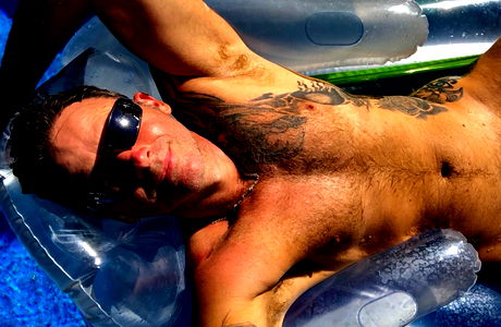 A man with tattoos lounging on a raft, posing for a photo. He is shirtless and wears sunglasses. His hair appears wet, suggesting he might have been swimming.