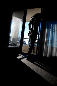 Catching a breath after a modeling session, Aussiefit1 poses with confidence against a soft light.