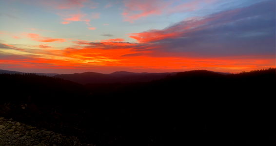 A vibrant sunset over a mountain range, captured in Austin's model photo. The sky is a canvas of warm hues with pink and orange dominating the scene.