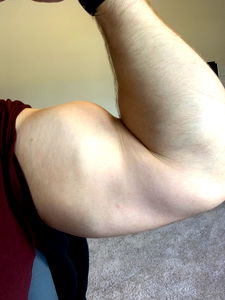 Powerful physique showcasing a well-defined bicep in the gym. Age 28 years old.