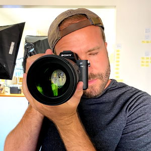 An individual engaged in photography using a professional camera. The man appears to be in the process of capturing an image, possibly a portrait or still life given the close proximity of the subject to the lens.