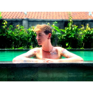 A young man from Edinburgh, Scotland posing shirtless next to a pool. He has tattoos and is seen smiling and looking directly at the camera.