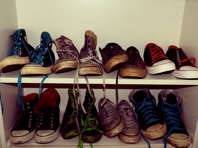 A collection of used shoes showcasing different styles, brands and conditions, with a focus on durability and personal use. The shelf appears to be in an area of a store or home where personal belongings are stored. These shoes may have sentimental value, reflecting the owner's tastes and experiences.