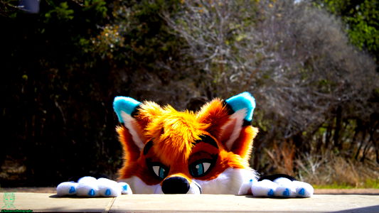 Autumn, a charming anthropomorphic fox from Florida, is posed as if ready to step into a new world. His colorful fur and big eyes give him an adorable look. The blue background adds a pop of color, making Autumn stand out.