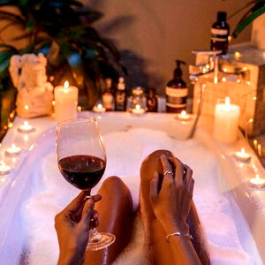 Ava Rich, Canada's onlyfans model, enjoys a relaxing evening in the tub surrounded by candles and bottles. Her feet are soaking up the warm water while she sips on some red wine. The ambiance is romantic and cozy, making for an ideal self-care moment.