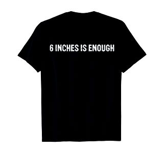 6 inch t-shirt for the Average Dick Army, made of soft fabric, with a humorous design featuring a black t-shirt and white writing that reads '6 inches is enough'. It's perfect for men who want to make a statement without spending too much on clothes. 50% cotton, 50% polyester blend ensures comfort and durability. This product is an excellent gift for someone who enjoys humor and wants to showcase their personality. 100% satisfaction guaranteed!
