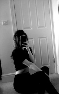 In the image, a young woman is captured in an indoor setting. She is sitting on the floor with one leg crossed over the other. The room has a simple interior design with minimal decorations. The model is wearing a casual black top and is holding a smartphone in her hand. Her face shows a relaxed expression as she seems to be taking a selfie or perhaps preparing for a video call. The natural light from a nearby window illuminates the scene, creating a soft ambiance. The image could be used for various purposes, such as modeling portfolios, advertisements for fashion and lifestyle brands, or even personal social media profiles.