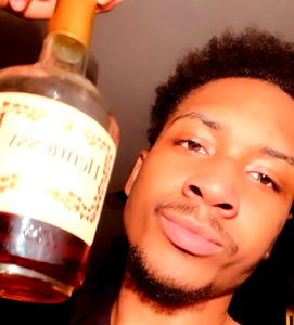A young man holding a bottle of Hennessy, captured in the moment of celebration or relaxation.