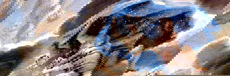 The artwork portrays a celestial scene featuring an angel, surrounded by other angels, rendered in a classical style with a predominantly blue palette.