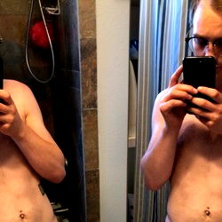 A shirtless mirror selfie taken by Cary E. in a bathroom.