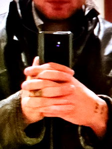 This is a photograph of A.Woloszynski, a model from Europe. He appears to be a young man with short hair, wearing a leather jacket and taking a selfie in the mirror. The background suggests an indoor setting, possibly near a door or entrance area.