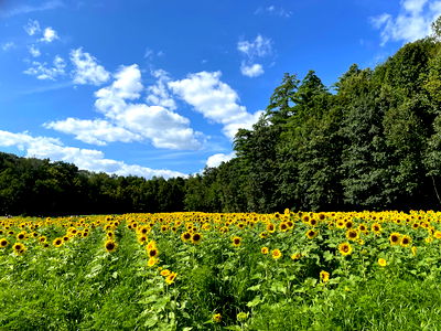This is a photo of a young man standing amidst sunflower plants. He appears to be enjoying the outdoors, dressed casually with a tie-dye t-shirt, wearing a bright smile.