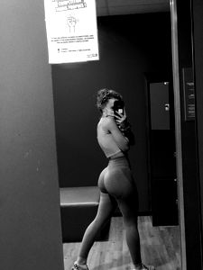 Zoรฉ, a model and fitness enthusiast, showcases her gym attire. She is posing confidently in a gym, standing next to a mirror that reflects her pose. Zoรฉ's outfit consists of form-fitting workout clothes, with her highlighting the athletic wear she has chosen.