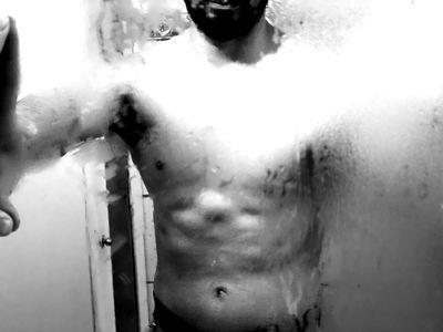 A fit model takes a shower selfie, showcasing his toned physique. Tagged with #Fitness #OnlyFans #ModelLife.