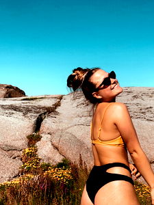 This stunning AXESS model from Norway is enjoying a summer day outdoors. Dressed in a vibrant yellow bikini, she's soaking up some rays while striking a confident pose. Her radiant smile and joyful demeanor truly embody the carefree spirit of summertime.