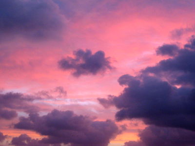This is a beautiful image of a pink sky at sunset, filled with fluffy clouds. The hues of pink and purple are vibrant, creating a serene and calming atmosphere.