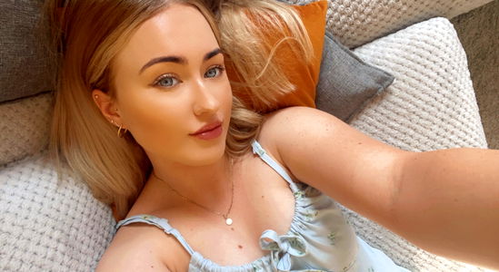 A young woman posing in a blue outfit. She wears glasses and has blonde hair, creating an engaging selfie. The image is clear and high resolution.