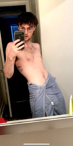 Photograph of a young adult male model posing with one hand on hip and the other touching their stomach. He's standing in front of a mirror with a towel draped over one shoulder, capturing a moment of casual confidence.