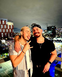 A young man with a beard and tattoo, wearing a black baseball cap and sunglasses, stands confidently next to his friend. They are both dressed in casual attire, suggesting a relaxed, social event. The background reveals a skyline, indicating they might be on a rooftop or high building, adding an urban feel to the photo.