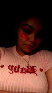 A person with a unique sense of style is seen, wearing a fun and quirky t-shirt. They have heart-shaped makeup on their cheeks, adding to the playful vibe. The lighting suggests an intimate indoor setting, creating a warm and inviting atmosphere.