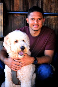 Man holding a cute dog, posing for the camera.