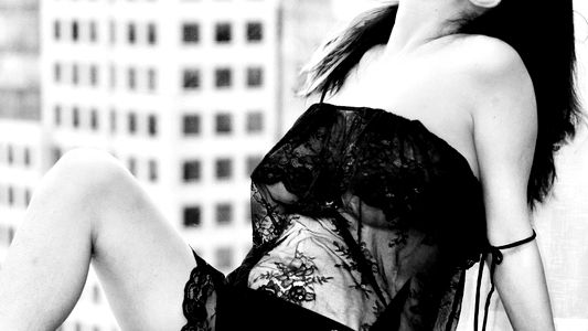 A young, beautiful woman in a black lace bodysuit leaning on the window of a building. She has dark hair and is posing sensually.