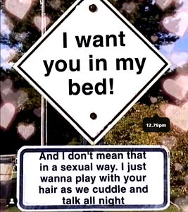An Azia Rae meme captures the absurdity of romance-seeking signage, showing a funny twist on a classic 'I love you' sign with a cheeky invitation to bed.