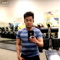This is a photo of a man taking a selfie in a gym. He is wearing headphones and has a casual, relaxed demeanor while standing near a treadmill with various exercise equipment in the background.