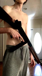 Bryce is seen in this casual photo, holding a gun and wearing only pants. The room has a window, suggesting an indoor setting.