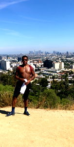 This is a promotional image of WavyDom, the onlyfans model, standing on a hilltop overlooking the city. He is dressed in athletic attire and holds a white towel.