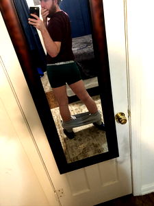 Bradley, an OnlyFans model, is posing confidently in a bathroom mirror. He is captured from the back, displaying his physique and fashionable underwear. His pose and expression suggest a relaxed and comfortable demeanor.