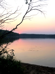 A peaceful scene of a sunset on the horizon, reflecting off a lake with trees in the foreground. The calm water and quiet setting evoke tranquility.