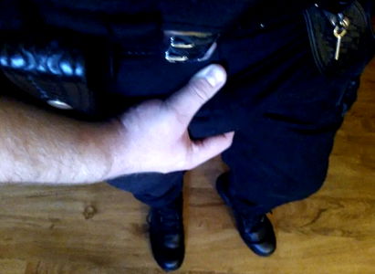 A police officer wearing a protective vest, standing in a room with white walls. The officer is looking down, holding what appears to be a piece of paper or card in hand.