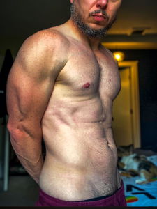 A man in a New Hampshire setting is shirtless, flexing his abs and showcasing a visible tattoo. He stands against a door, his arms crossed over his head.
