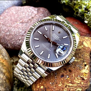 A luxury watch with a silver band, set against a natural rock backdrop. The watch features a blue face and is an edition from the brand Rolex. It's a men's watch and would appeal to fashion enthusiasts and collectors.