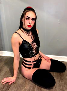 An OnlyFans model posing in a room with a unique outfit, emulating the style of an emo or gothic fashion genre. The image is rich in detail and showcases the model's confident and seductive persona.