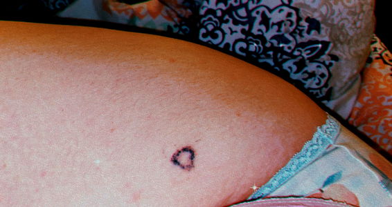 A high-resolution image captures a small, circular tattoo on the lower calf of an individual. The person is wearing blue underwear and appears to be resting their leg casually. Onlyfans model name Babiee โค๏ธ๐ฅฐ, from: Tennessee