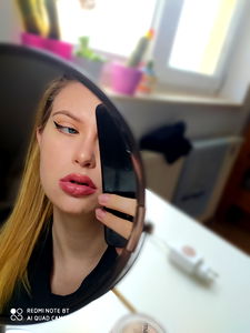 Alisha, a renowned Czech model, captures her moment in the mirror with a striking makeup look. Her gaze is intense as she adjusts her appearance in front of the camera. The backdrop of her homely space adds an intimate touch to this image.