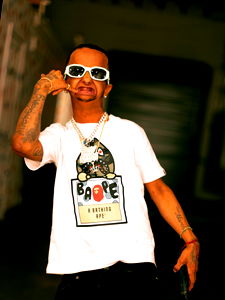 In the image, Baby Alien is seen standing confidently on a city street. He's donned in a vibrant white graphic t-shirt featuring a playful dog design. His sunglasses and gold chains add to his streetwise look. The text 'BABE!' is prominently displayed on his shirt, suggesting he might be excited about something or someone.