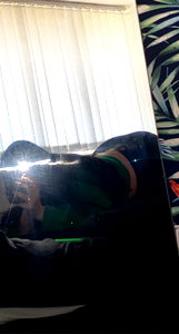 The image shows an individual with dark hair, dressed in casual attire. The person is lying down and appears to be taking a selfie, capturing the moment of relaxation. In the background, there's a glimpse of indoor surroundings with a window visible.