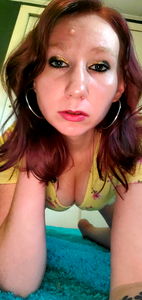 Red-haired woman posing in a vibrant yellow top on an outdoor surface.