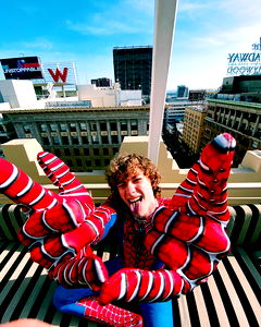 Cale, a passionate fan of the iconic Spider-Man series, is sitting on a balcony railing in a Spider-Man costume. His excitement is palpable as he strikes a dynamic pose, capturing the essence of a true fan's joy.
